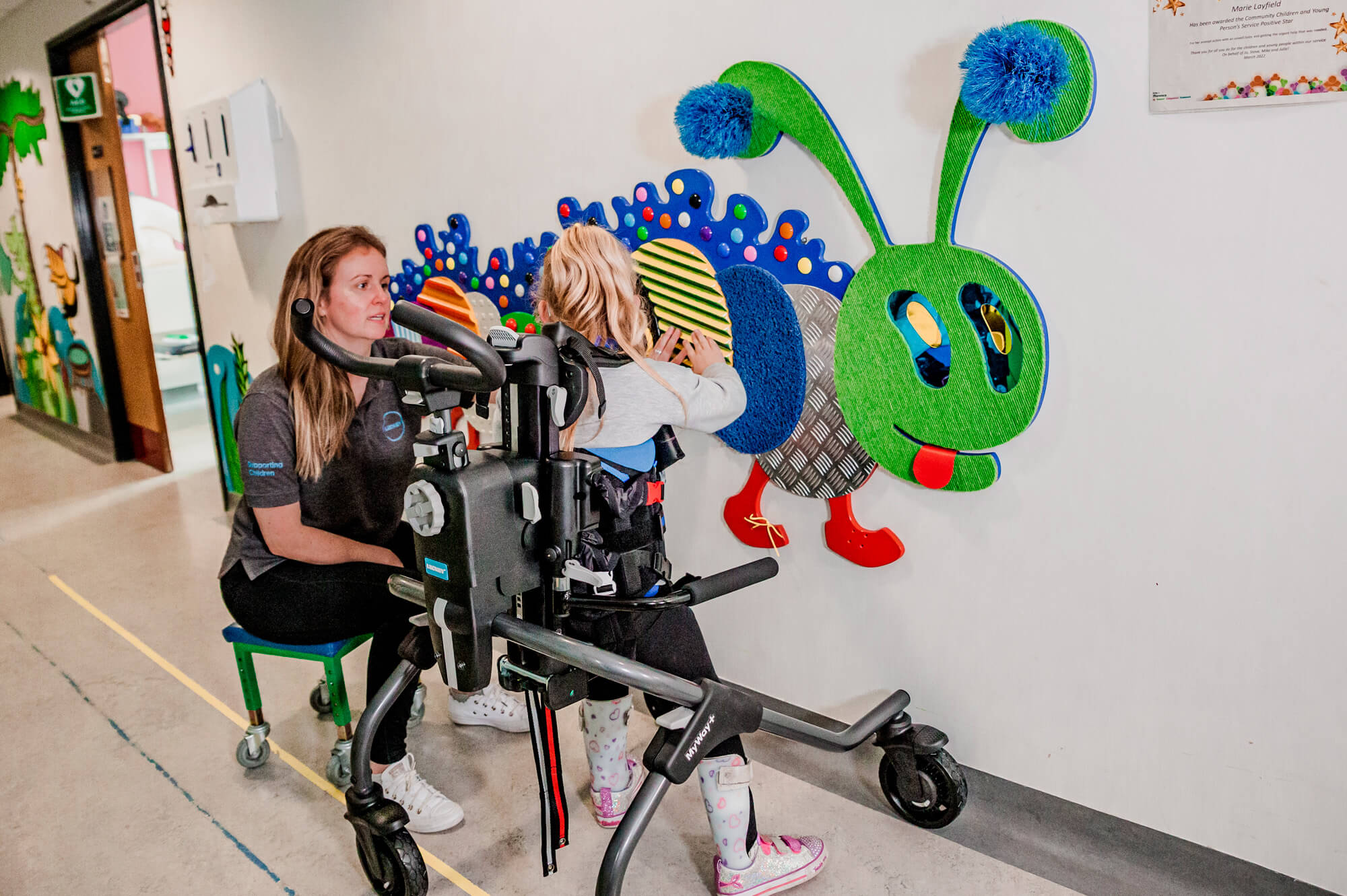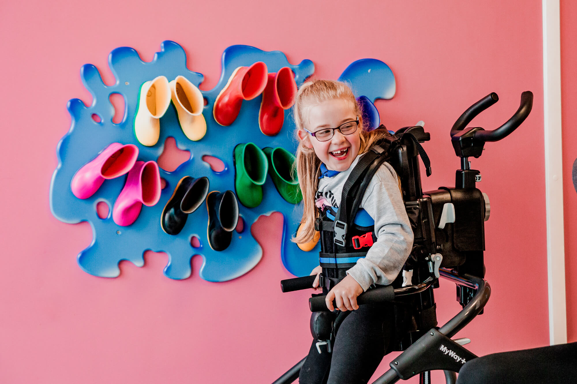 La regolazione senza attrezzi dell'inclinazione in avanti e la regolazione così precisa dell'altezza, insieme all'ampia gamma di accessori, consentono ai terapisti di ottimizzare la configurazione per consentire al bambino di partecipare al meglio ai momenti di gioco e di vita quotidiana.